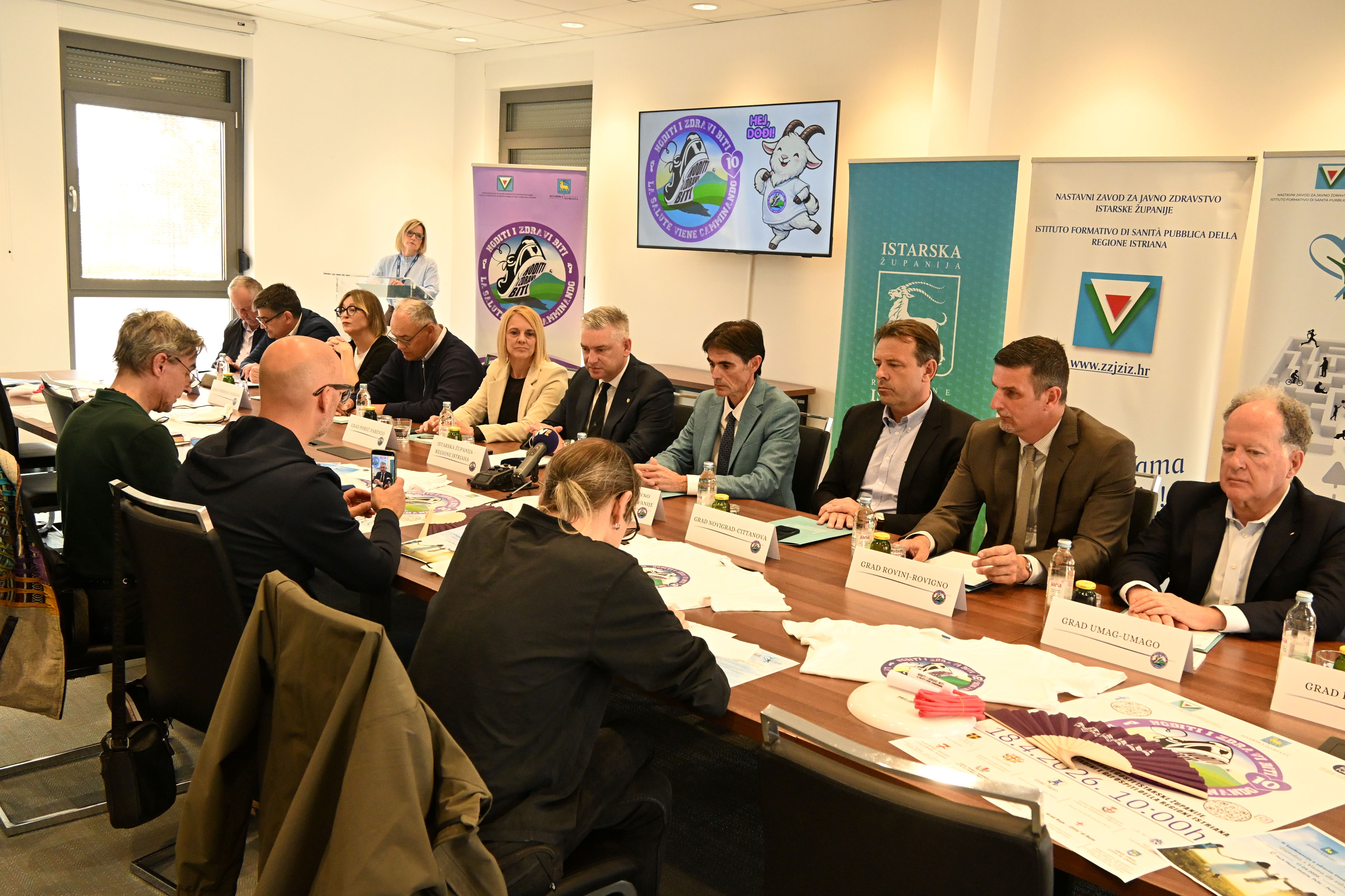 Deseta jubilarna manifestacija „Hoditi i zdravi biti – La salute viene camminando” održat će se istovremeno u svih deset istarskih gradova u subotu, 18. travnja, s početkom u 10 sati, s ciljem promocije zdravih životnih stilova, najavljeno je na današnjoj konferenciji za novinare održanoj u Nastavnom zavodu za javno zdravstvo Istarske županije, u Puli. Na konferenciji su sudjelovali ravnatelj Zavoda Aleksandar Stojanović, dr. med., istarski župan Boris Miletić, gradonačelnik Novigrada-Cittanova Anteo Milos, gradonačelnik Buzeta Damir Kajin i gradonačelnik Buja-Buie Fabrizio Vizintin, zatim zamjenik gradonačelnika Rovinja-Rovigno Dino Sošić, zamjenik gradonačelnika Umaga-Umago Mauro Jurman, zamjenica gradonačelnika Poreča-Parenzo Nataša Basanić-Čuš, zamjenik gradonačelnice Pazina Renato Kalac i zamjenica gradonačelnika Vodnjana-Dignano Manuela Geissa, te Helga Može, pročelnica Upravnog odjela za društvene djelatnosti, mlade i sport Grada Pule-Pola, Borjan Batagelj, pročelnik Upravnog odjela za društvene djelatnosti Grada Labina i Tihana Mikulčić, pročelnica Upravnog odjela za društvene djelatnosti Grada Poreča-Parenzo.