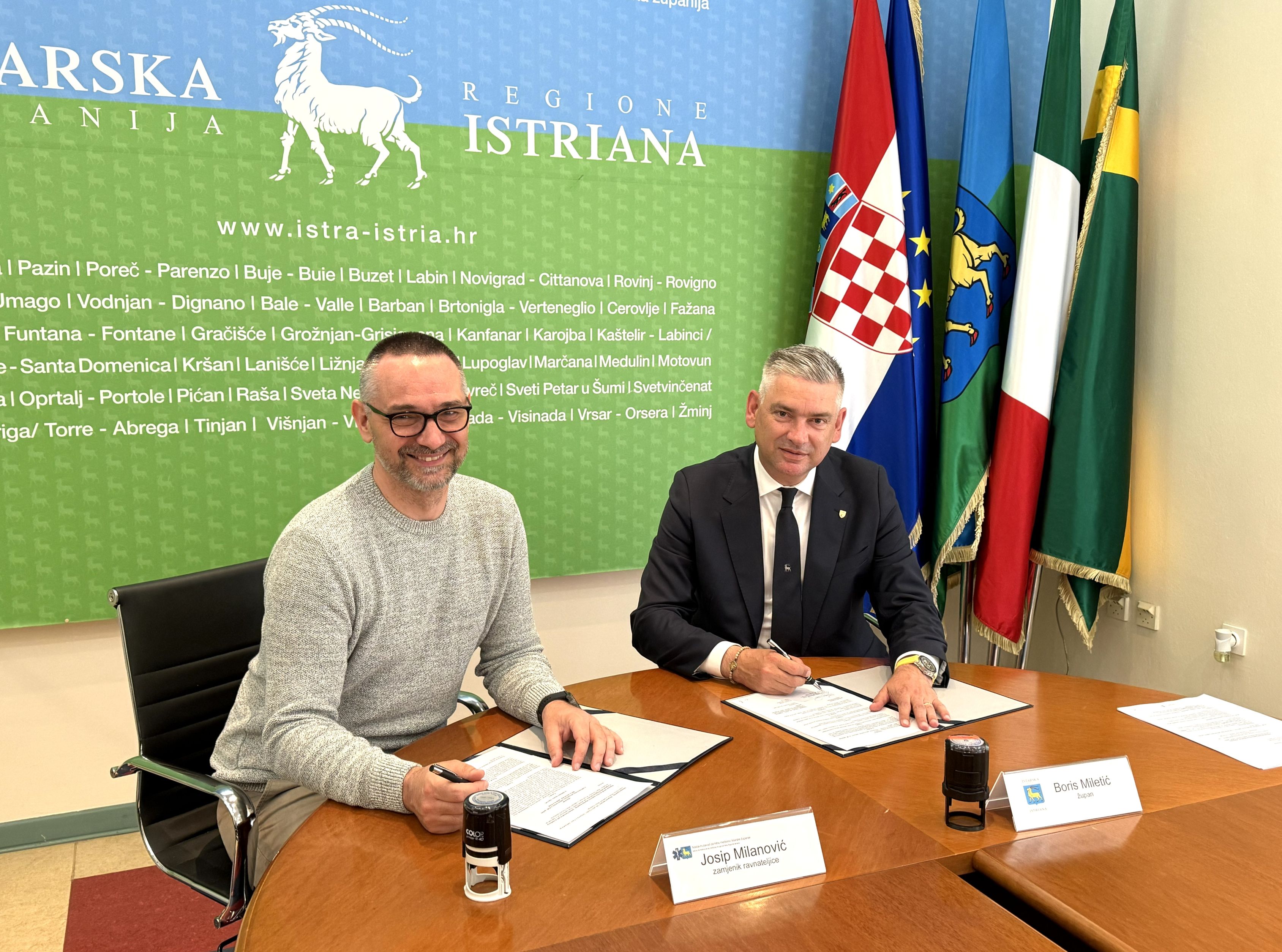 Tim su povodom, u sjedištu Istarske županije u Puli, župan Boris Miletić i zamjenik ravnateljice Nastavnog zavoda za hitnu medicinu Istarske županije (NZHMIŽ) Josip Milanović, dr. med., potpisali Ugovor o sufinanciranju zdravstvene zaštite turista u 2026. godini. Ugovorom, vrijednim 1.634.750 eura, Istarska županija financira povećani broj timova hitne medicinske službe od 1. travnja do 30. rujna ove godine.